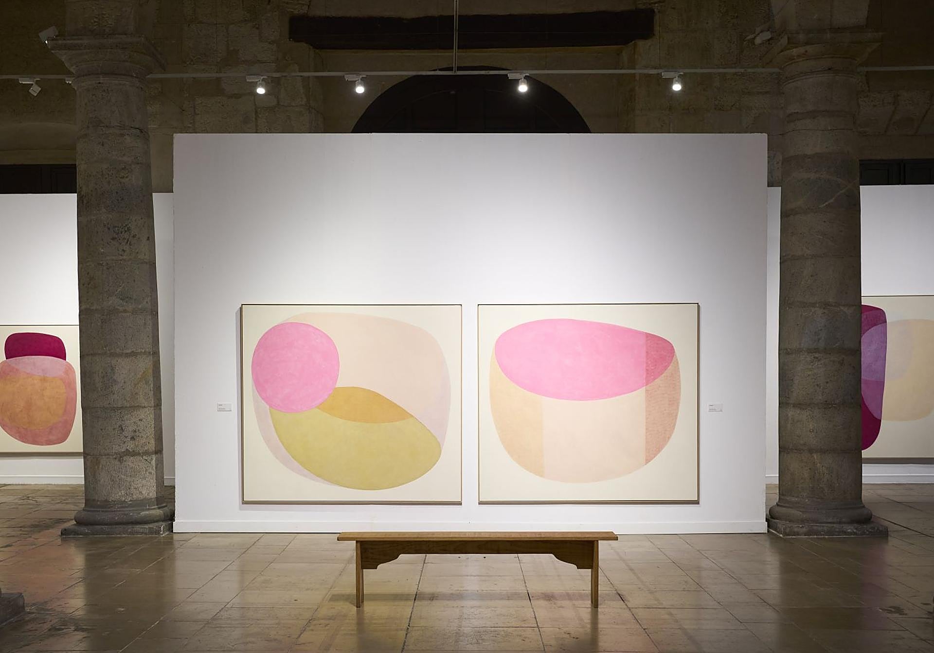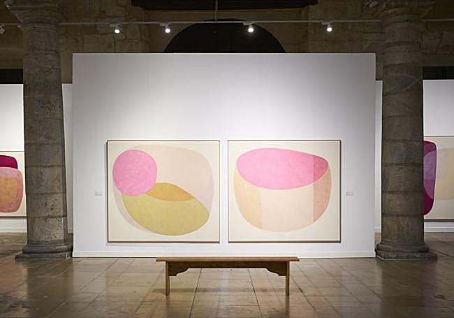 Las palabras que Diotima, 'La extranjera' de Mantinea, le dice a Sócrates en El Banquete de Platón («Si por algo tiene sentido esta vida, es por la contemplación de la belleza absoluta»), son el hilo inductor de la exposición de Maru Quiñonero en el Palacio Almudí de Murcia. Los conceptos de amor y belleza recorren la muestra -hasta el 26 de julio- como los personajes de Platón, Diotima opina que el amor hace que los humanos aspiren a la belleza y busquen la verdad, entre ellos asegura que los que más interés ponen en esa búsqueda son los artistas. Las paredes del Almudí se visten de lienzos protagonistas, colores nuevos, pintura en capas, transparencias infinitas y lápiz compartiendo soporte, composiciones cerradas y precisas, vastas superficies de color.