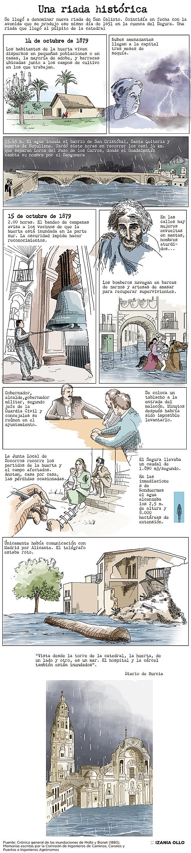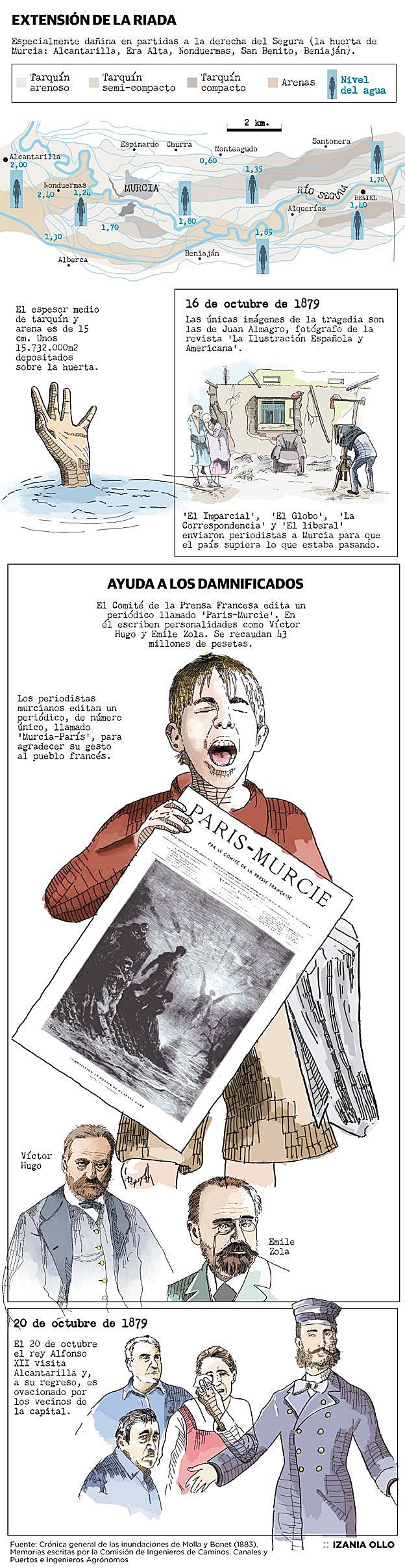 ¿Qué ocurrió para que la alta sociedad de París exhibiera su solidaridad con Murcia en la mítica fiesta 'París-Murcia' y para que incluso el eco de aquel pasmo mundial apareciese en 'Un amor de Swann', la segunda parte de 'Por el camino de Swann' de Marcel Proust? Jean Moline, de la Universidad François Rabelais de Tours (Francia), recuerda [en un artículo publicado en 2015 en el número 28 de la Revista de Estudios Filológicos] que aquel 15 de octubre de 1879 hubo que lamentar «más de 1.000 muertos, 700 de ellos en Murcia, y 2.000 heridos». Aquel día de Santa Teresa, «el río Segura se elevó, en solo unas horas, diez metros a su paso por Murcia y por Orihuela. La Vega Baja quedó anegada. El caudal del río fue de 1.900 m³/s», destrozando puentes y toda la red de acequias, echando abajo 6.000 casas y pereciendo miles de animales. Un día antes, en el Valle del Guadalentín, se vivieron escenas dantescas. El frente de la riada llegó a Lorca sobre las 14.30 horas del 14 de octubre; una hora más tarde el barrio de San Cristóbal, Santa Quiteria y la huerta de Sutullena estaban inundados. No hubo forma de contener los torrentes en dirección a Murcia. A las dos de la madrugada del día 15 las campanas de Murcia tocan a rebato. Las caracolas de los huertanos emitían un desespertado sonido. Mal fario. Los serenos volaban despavoridos. Pero no había escapatoria. Sobre todo para los lugareños de Era Alta, Aljucer, Nonduermas, Voz Negra y Alcantarilla, que quedaron como naves a la deriva en un mundo que parecía que iba a acabarse. «En esta noche pasada, la avenida más terrible del río que se ha reconocido, ha destrozado con sus negras, rugientes, y pestíferas olas, inmensas riquezas, y, ¡Dios sabe!, las víctimas que habrá causado», escribiría al día siguiente Martínez Tornel en su 'Diario de Murcia'.