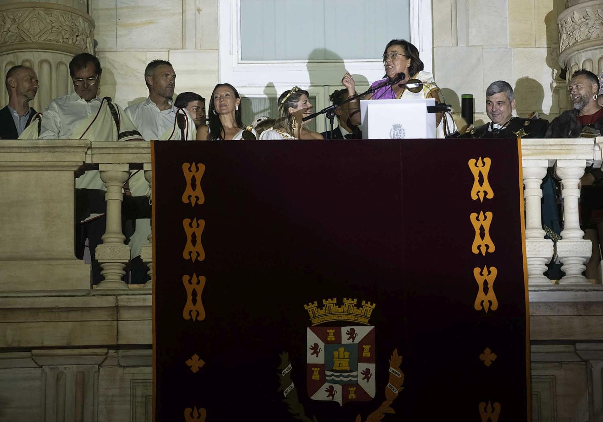La también exdiputada regional, emocionada, reivindicó el estrecho vínculo entre estas fiestas y la recuperación del patrimonio arqueológico de la ciudad. «Unas fiestas que rescatan nuestra impresionante Historia Antigua, que desde sus inicios han apoyado la recuperación de nuestro Patrimonio Arqueológico», proclamó desde el balcón del Palacio Consistorial ante una plaza abarrotada.