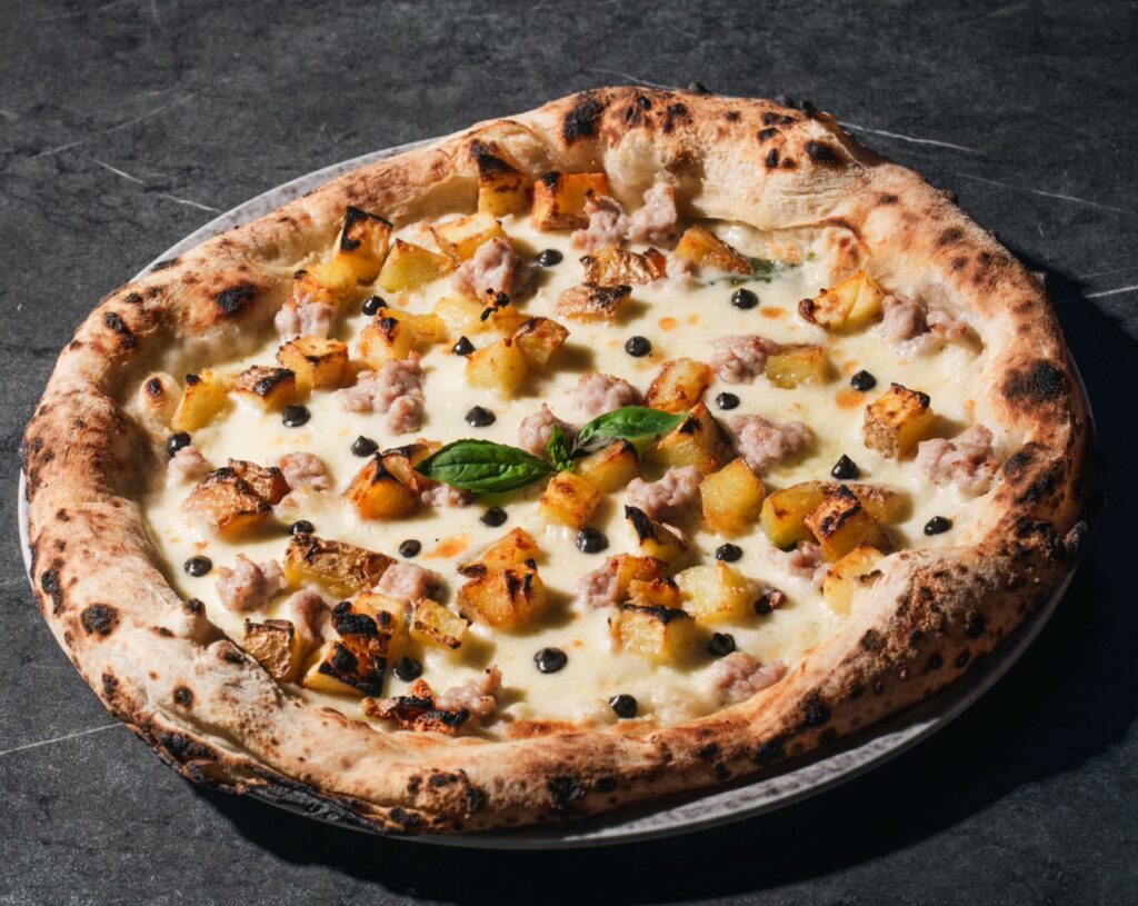 Destaca por trabajar solamente con harinas italianas de gran calidad, fermentaciones entre 24h y 48h. Hace una receta única fusionando dos tipos de pizza, napolitana y romana, consiguiendo una masa muy hidratada que aporta esponjosidad, con una fermentación lenta que contribuye a una buena digestión.