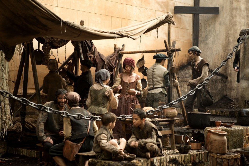 CONTRASTES. Palacios, banquetes, golas, oro, plata... por un lado. Fruta podrida, harapos, guetos, enfermos, por el otro. La Sevilla barroca que recrea La Peste es una ciudad bipolar con dos velocidades claramente diferenciadas y delimitadas por sus murallas, pero también una auténtica Torre de Babel donde se hablaban más de 50 idiomas. Dentro, se comercia y gobierna mirando a los ricos y a los nuevos ricos, mientras que en los arrabales la peste va asolando, aún más, a una población paupérrima que sobrevive como puede.