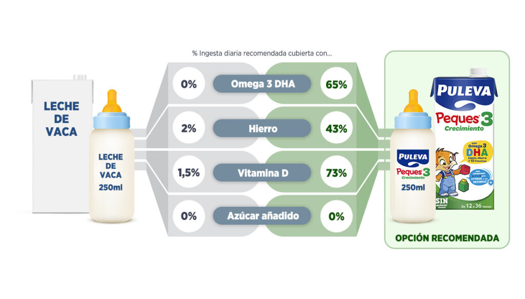 Concretamente, un vaso diario de Puleva Peques, la leche enriquecida de Puleva dirigida a niños y niñas de 1 a 3 años, aporta más del 60% de la cantidad diaria aconsejada de Omega 3 DHA.