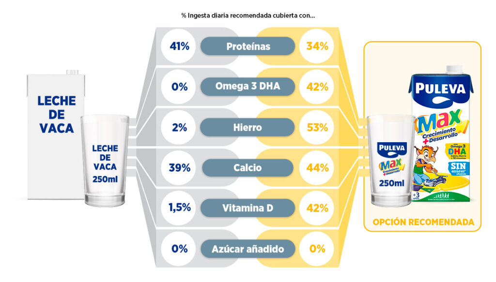Entre los 3 y los 12 años, Puleva Max aporta más del 40% del Omega 3 DHA recomendado, pero también calcio y 13 vitaminas, entre ellas la A, C y D.