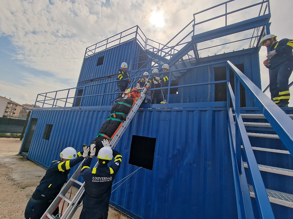 Para ello, UNIVERSAE complementa los conocimientos teóricos con los adquiridos sobre el terreno en un campo de prácticas de más de 7.000m2, ubicado en la Región de Murcia, donde los estudiantes pueden realizar simulacros en entornos reales, desde rescates en altura a entornos acuáticos. Entre los innumerables recursos que presenta este espacio destaca una estructura de tres pisos, una piscina de 25 metros, espacios que simulan vagones de trenes, embarcaciones, un contenedor de flashover –en el que se puede observar la evolución real de un incendio–, redes de conductos subterráneos y hasta un helicóptero con el que podrán simular intervenciones de emergencias de la mano de expertos.