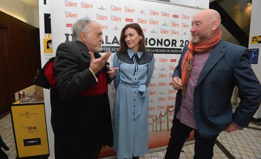 Marta Nieto y Antonio de Béjar fueron ayer nombrados Socios de Honor de la Unión de Actores y Actrices de la Región de Murcia (UARM), que preside Manuel de Reyes -en la foto, a la derecha-, durante la celebración de una gala que tuvo lugar en la Filmoteca Regional, y tras la cual se ofreció un ágape en el Casino de Murcia. Nieto ha sido nominada para los Premios Feroz y los Forqué, en la categoría de Mejor actriz protagonista, por su trabajo en 'Tres', un drama de Juanjo Giménez que cautivó en el Festival de Venecia.