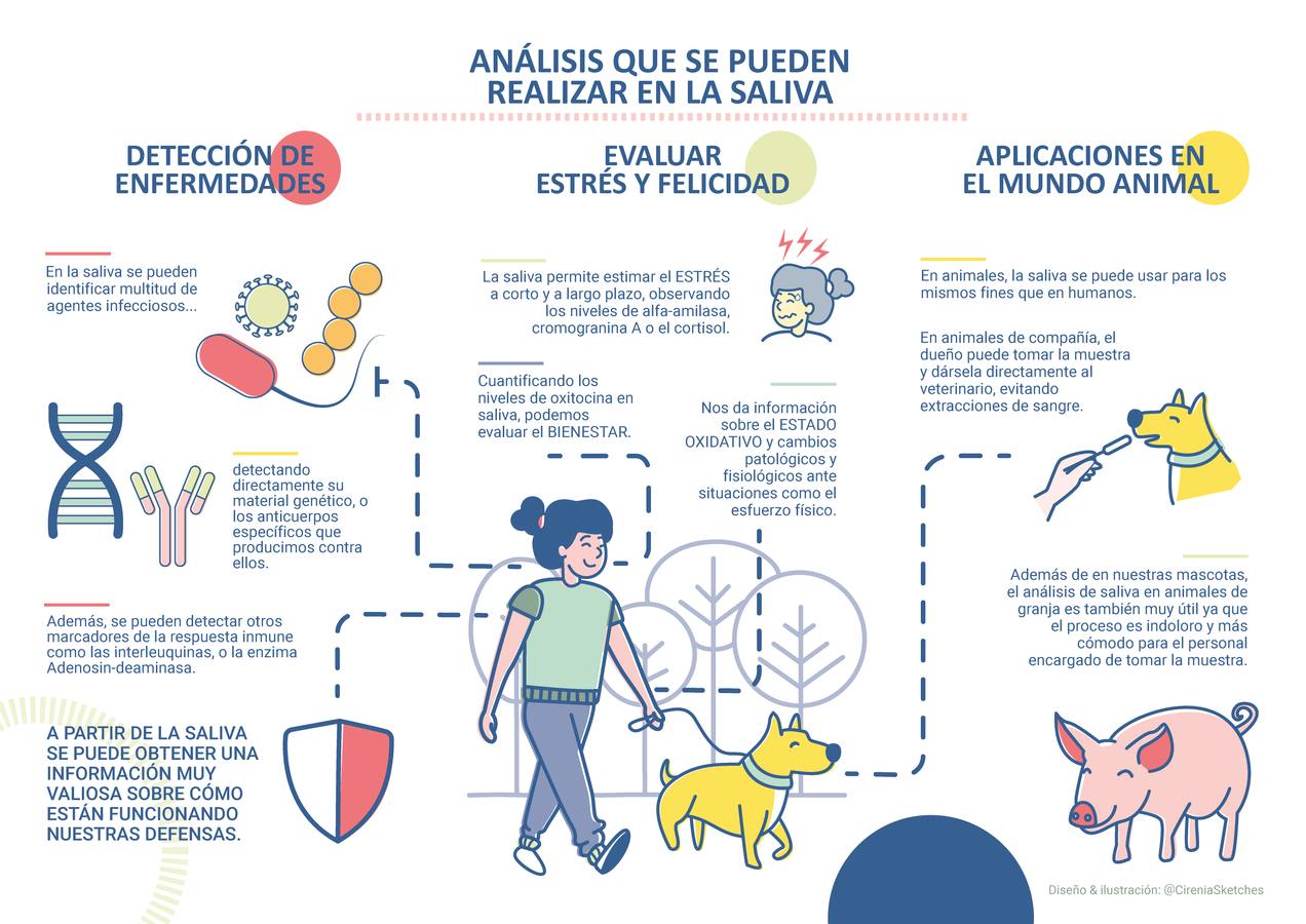 El estrés es solo una de las variables que se pueden analizar a través de las secreciones bucales, tanto de personas como de animales. La obesidad, con sus alteraciones metabólicas asociadas; el estado inflamatorio, y obtener información sobre el sistema inmune, y el estado oxidativo, por ejemplo, también dejan huella en la saliva, al igual que las enfermedades infecciosas, desde la covid-19 hasta la leishmaniosis.