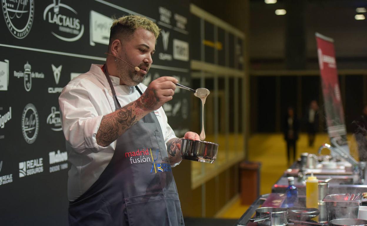 «Siempre he tenido mucho interés por las partes que no se usan», dice el Chef en su ponencia 'La casquería del atún rojo de almadraba', impartida en Reale Seguros Madrid Fusión en la segunda jornada del congreso gastronómico. «Si se usa la cococha, por ejemplo, por qué no utilizar el galete». De un ejemplar pequeño, de unos 60 kilos extrae el humor vítreo, «para conseguir con ese líquido de la retina un colágeno muy importante que, mezclado con aceite de oliva, da una textura similar al pil pil», explica este cocinero tatuado hasta los nudillos que se inspira en su padre, «un gran comedor de pescado, una de sus partes preferidas es el ojo». El plato se remata con una planta halófila, el 'hinojo marino'.