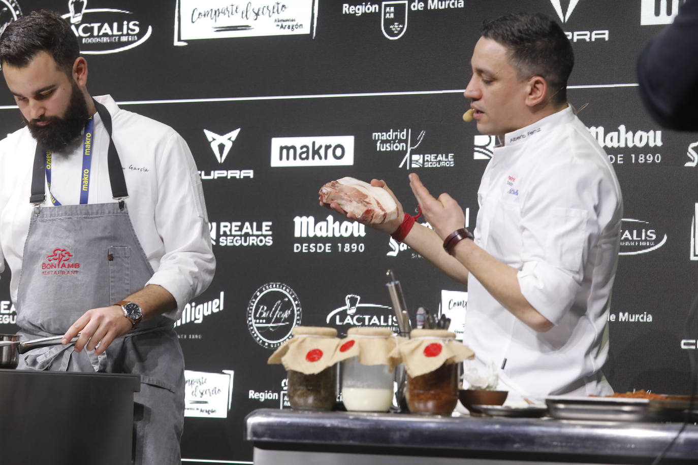 El chef aragonés reivindicó la vuelta a casa, a esas cocinas impregnadas con los olores de los caldos, guisos y demás exquisiteces de las abuelas. En Madrid Fusión, lo hizo a través de los productos de su tierra: el cordero agnei ibérico (ternasco de alta calidad) y el semidesconocido cerdo de latón de La Fueva. Un animal recuperado por un pastor hace tres décadas y que se alimenta de forma totalmente salvaje. «Solo hay una producción y no hay más. Son cerdos pirenaicos y felices», comentó el responsable del BonAmb, casa con dos estrellas Michelin situada en Jávea (Alicante). «Esta gente hace pancetas, sobrasadas...», enumeró desde el escenario con una pieza en la mano. «Son productos excelsos», remachó el cocinero.