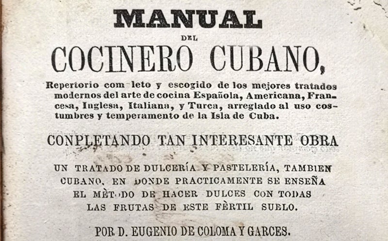 En 1856 don Eugenio Coloma publicó bajo las siglas «E. de C. y G.» el «Manual del cocinero cubano», repertorio según su portada «completo y escogido de los mejores tratados modernos del arte de cocina española, americana, francesa, inglesa, italiana y turca, arreglado al uso, costumbres y temperamento de la Isla de Cuba». Suena así como muy cosmopolita e internacional, pero en realidad sus 337 páginas y 728 recetas están dedicadas en su mayor parte a desgranar las delicias gastronómicas cubanas. Por entonces la cocina cubana estaba no sólo ya completamente diferenciada de la española, sino que era apreciada por todos los estamentos sociales de la isla. Tanto esclavos como agricultores, comerciantes o potentados compartían una misma base culinaria que, aunque diferenciada en calidad y cantidad, llenaba las mesas de ricos y pobres por igual de arroz blanco, frijoles, ajiaco y tasajo. En las mansiones criollas estos platos típicos se comían en la intimidad, reservando las recetas españolas y europeas para cuando venían invitados.