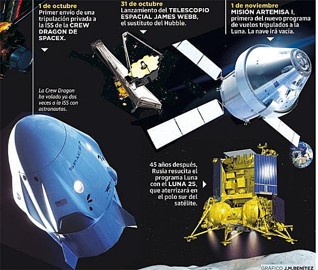 La Estación Espacial Internacional (ISS), la Luna, el punto Tierra-Sol L2, el asteroide Dimorphos, Marte, Júpiter... Los destinos de las misiones espaciales del año ... 2 después del coronavirus son tan variados como interesantes. La ya vieja ISS –su primer módulo se puso en órbita en noviembre de 1998 y está ocupada desde el 2 de noviembre de 2000– seguirá siendo el puesto humano avanzado en la última frontera, que diría Gene Roddenberry, el creador de 'Star Trek'. Y será el destino de varios vuelos privados que, si todo va bien, harán historia. El complejo orbital está a las puertas de casa, a 420 kilómetros de altura –un poco más cerca que La Coruña de Bilbao, en línea recta–, mientras que, cuando en verano la sonda Juno prolongue su misión en Júpiter, el gigante gaseoso estará a unos 610 millones de kilómetros de nosotros, cuatro veces más lejos que la Tierra del Sol.