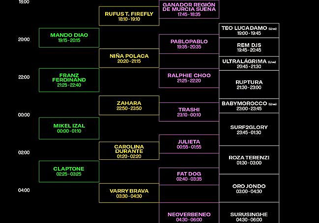 Por su parte, el escenario ElPozo King Upp comenzará el viernes con Rufus T. Firefly, que desplegarán su rock atmosférico, seguido de Niña Polaca y Zahara, antes de que Carolina Durante incendien el recinto con sus himnos generacionales. El cierre de la noche lo pondrán los murcianos Varry Brava, expertos en convertir cualquier concierto en una pista de baile. El sábado la música seguirá con Alcalá Norte, revelación del post-punk nacional, Sexy Zebras y su potencia cruda, y los siempre sólidos Dorian. Y, ya, de madrugada, Siloé y Polo & Pan serán los encargados de mantener el pulso hasta el amanecer.