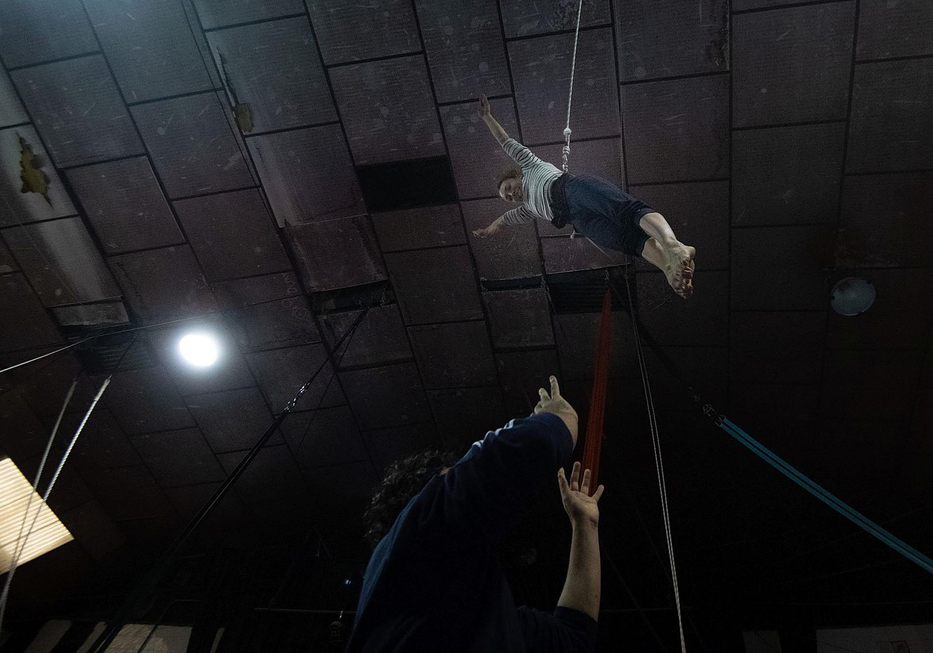 Concentrados y con seguridad, los acróbatas implicados en cada uno de los ejercicios se coordinan y escuchan, dejándose dirigir por las respiraciones de los compañeros, que son la guía de los movimientos. «Ahora sin pensar, en modo automático», les comenta el acróbata murciano Andrés Somoza, que lleva más de 10 años trabajando en la compañía francesa 'XY' y que ahora entrega su experiencia a este proyecto como director de la técnica acrobática.