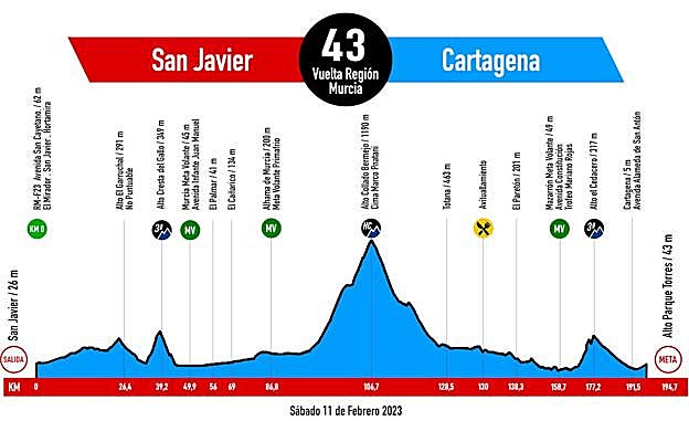 Cartagena será el final, por segundo año consecutivo. El recorrido, como es habitual en la carrera, será muy exigente. Serán 193,6 kilómetros, con tres puertos de montaña puntuables, tres metas volantes y un final en alto inédito. Comenzará en el nuevo Parque Almansa de San Javier, localidad por la que discurrirán los kilómetros neutralizados con dirección a El Mirador. Allí estará el K-0 y se dará la salida real de la carrera.