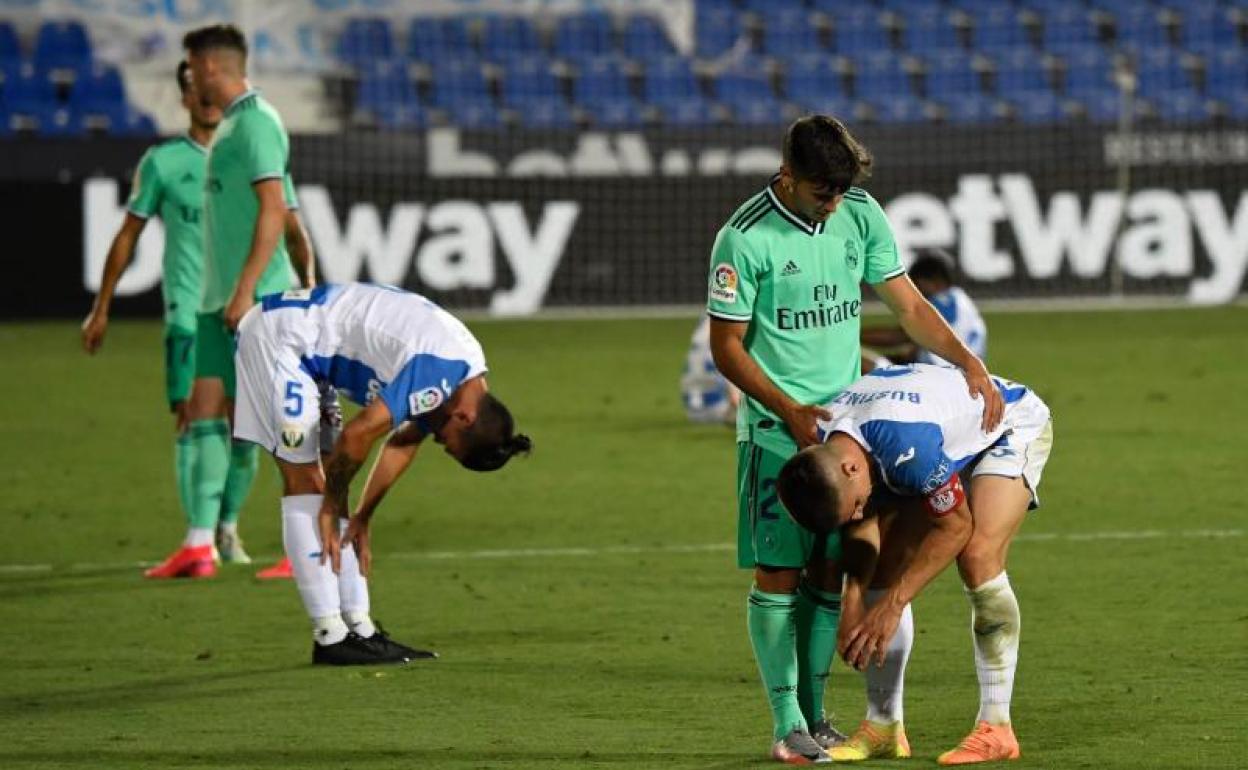 No hubo milagro en Butarque. Y no porque el Real Madrid se emplease a fondo, más bien todo lo contrario, sino porque al Leganés quizá no le da para más que para descender con dignidad. Si no tienes pegada porque a mitad de curso te quitan a Braithwaite y En-Nesyri, tus dos estiletes, y le haces dos goles al líder pero atrás cometes imprudencias de novato, estás muerto. Más aún si en el tramo final no te pitan un penalti a favor por una mano de Jovic que dará que hablar. Resacoso tras conseguir el ansiado galardón, se lo tomó a beneficio de inventario el conjunto de Zidane, que cortó con este empate su estratosférica racha en diez victorias seguidas en la nueva normalidad.