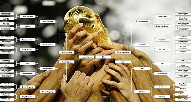 Fue así como el famoso gol de Maradona quedó eliminado a las primeras de cambio, cuando fue derrotado por el que le marcó el peruano Teófilo Cubillas a Escocia en 1978. El gol de Cubillas también superó la fase de octavos de final, pero fue derrotado en cuartos por el tanto que el colombiano James Rodríguez marcó contra Uruguay en Brasil 2014.