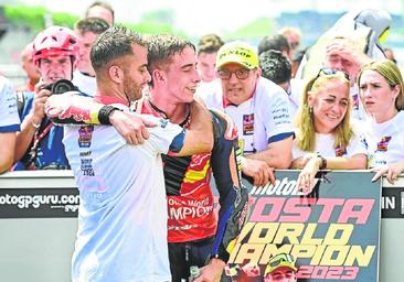 Arbolino no pudo ganar posiciones en la salida y su necesidad de remontar le salió cara. En la segunda vuelta intentó un adelantamiento imposible y el italiano estuvo a punto de irse al suelo. Se tocó con Ogura y Canet y salvó la caída pero perdió cualquier opción de evitar el título del 'Tiburón' al caer hasta la vigesimocuarta posición. El italiano tenía que quedar en el podio para seguir con opciones en el mundial, algo que era imposible para él tras ese incidente. Acosta pudo saborear y disfrutar en cada curva y en cada vuelta un título más que merecido y en el que no ha tenido rival en la segunda parte del campeonato. De hecho, le han sobrado dos carreras. Con un 'caballito' entró a meta el mazarronero para celebrar un mundial que celebró sobre la pista con sus padres y una de sus hermanas. También Fermín Aldeguer fue uno de los primeros en acercarse a felicitar a Acosta por su nuevo éxito.
