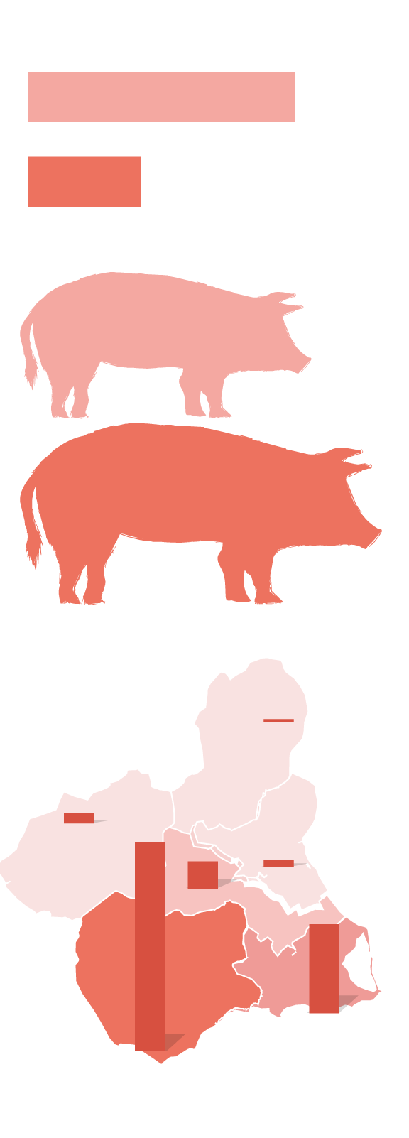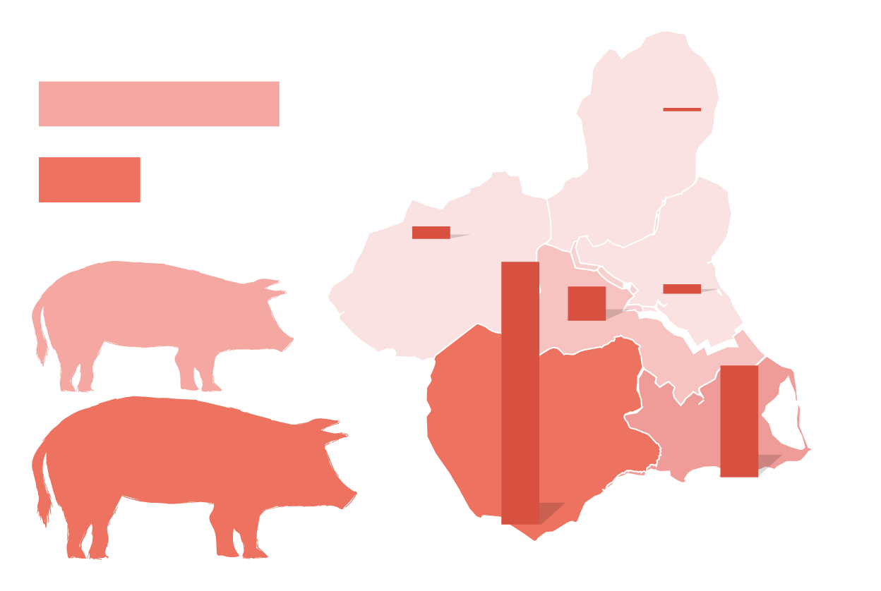 Aunque en volumen absoluto, el liderazgo del país en porcino lo mantiene Cataluña con casi 8,2 millones de cabezas, seguida por Castilla y León (4.4 millones), Aragón (4.1), Castilla-La Mancha (2,7) y Andalucía (2.5 millones). Mientras que justo por detrás de la Región se encuentran Extremadura (1,68 millones), Galicia (1,4 millones) y Comunidad Valenciana (1,38 millones de cabezas).