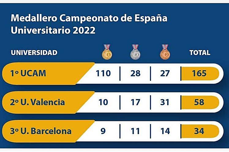 Este año, a falta de un par de semanas para que finalicen los Campeonatos de España Universitarios 2023, la UCAM ya se ha posicionado en el primer puesto del medallero, el cual domina de forma clara desde hace más de una década.