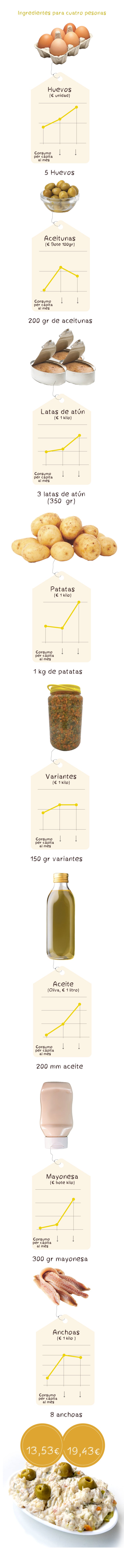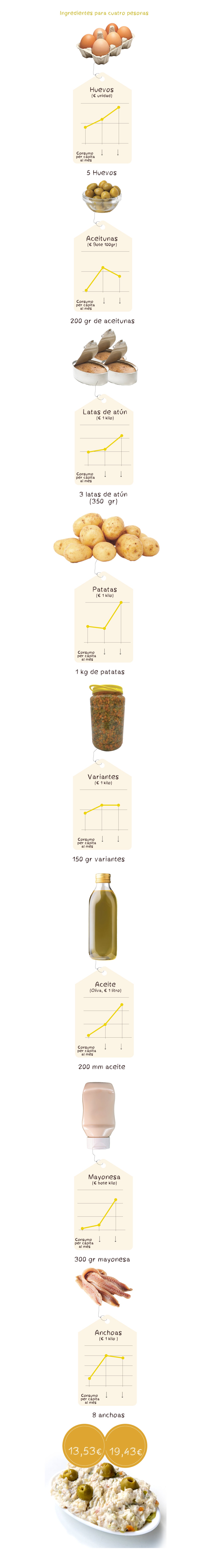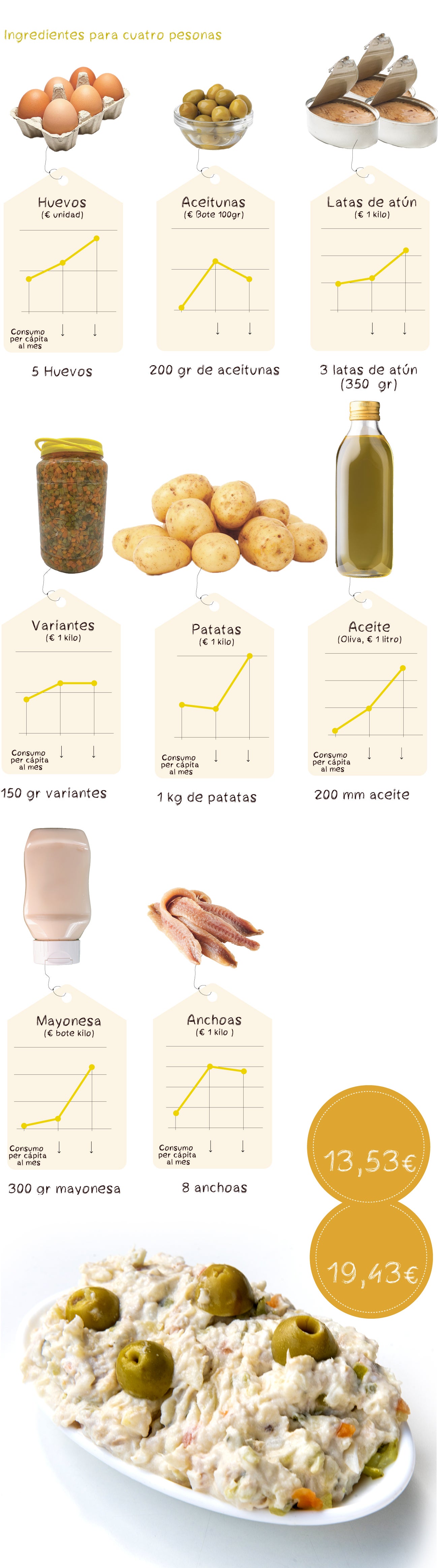 Los huevos son imprescindibles para hacer la ensaladilla y en los últimos 12 meses han pasado de 0,16 euros la unidad a 0,19 en la Región. El aceite está a 6,45 euros, el oliva de marca blanca y por encima de 8,00 euros el virgen extra. Además, la patata, sale a 1,00 euro el kilo, de media, frente a los 0,87 euros que costaba hace un año. Y aquí no acaba la cuesta arriba. El ingrediente estrella, el atún, está a 10,40 euros el kilo (por encima de la media nacional, 10,24 euros) y el año pasado costaba 8,35 euros.