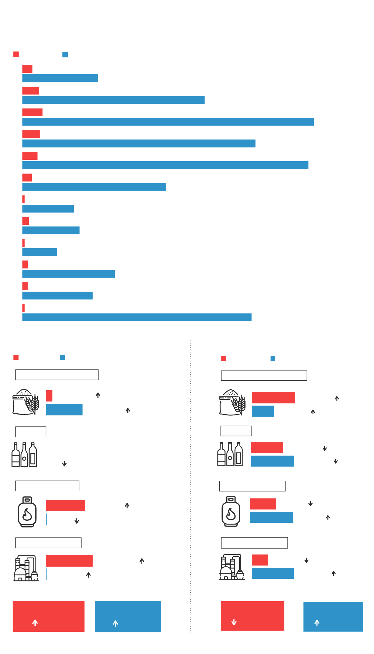 Los bienes industriales incluyen hidrocarburos. En 2012 se disparó la compra de crudo ruso ante el colapso de Libia. En agosto de 2014 Rusia bloqueó la importación de alimentos europeos, salvo bebidas y conservas.