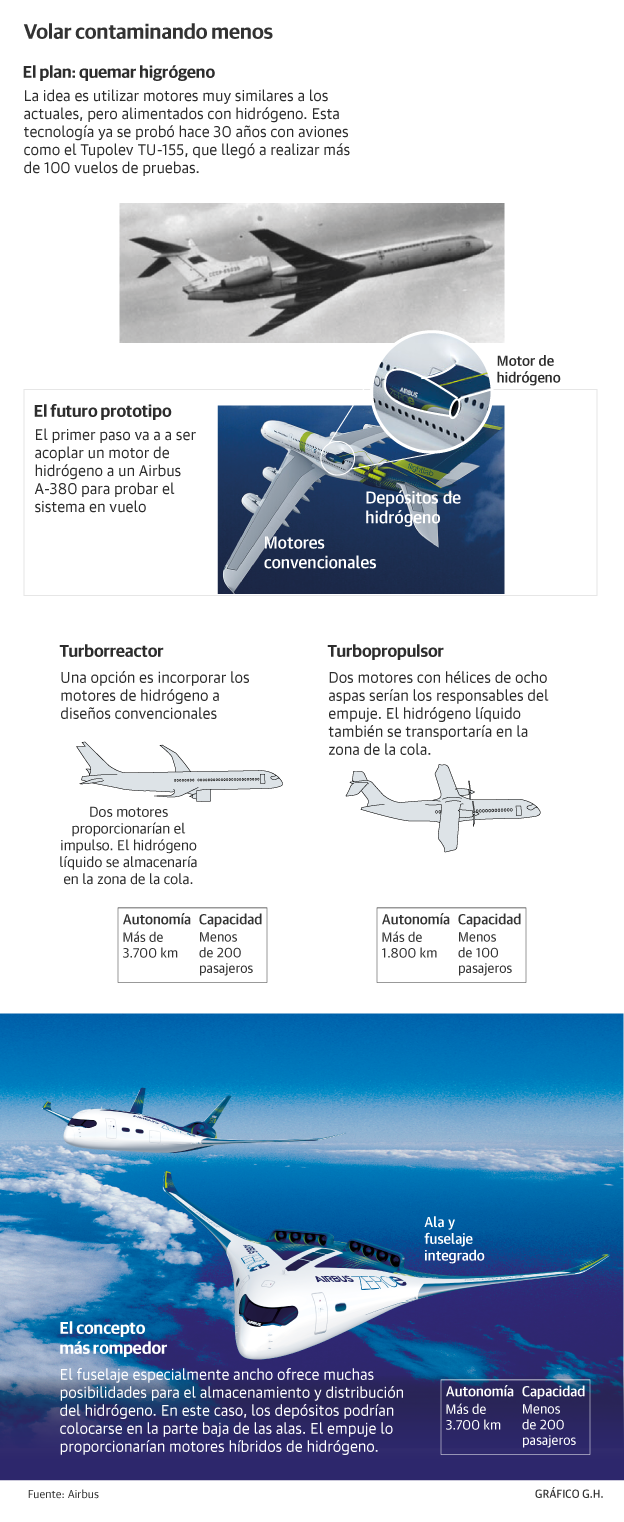 Se descartan, por ahora, otras vías para implementar en los aviones, como el motor eléctrico. «La apuesta de Airbus por el hidrógeno es decidida. Disponemos ya de varias ideas, tanto para aviones reactores, como turbofans (motor de hélices), además de un diseño rupturista, en el que las dos alas del avión se unen en un cuerpo central capaz de albergar el considerable tamaño de los depósitos de este combustible verde», apunta Lazcano, que además de directiva de Airbus es doctora en Ciencias Químicas, con máster en Materiales Poliméricos. La próxima década será clave para definir el avión del futuro. Hace falta mucha investigación para resolver problemas críticos como la mayor densidad del hidrógeno frente al combustible tradicional, lo que obliga a destinar buena parte del fuselaje al almacenaje de los tanques.
