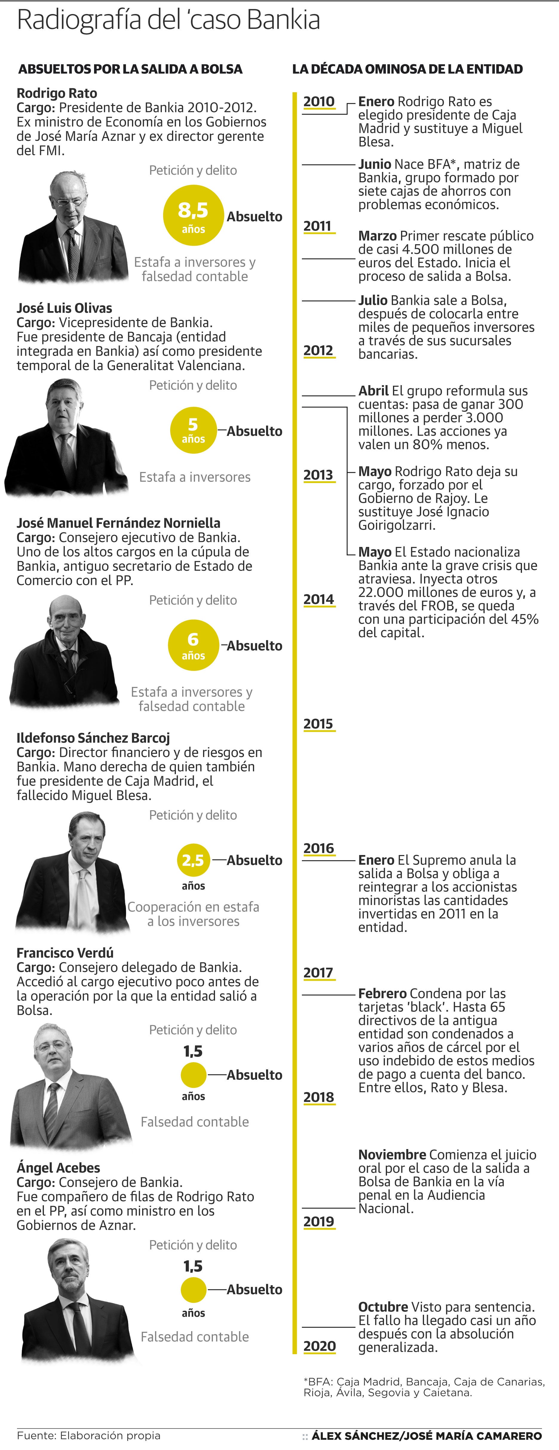 Rodrigo Rato se encuentra cumpliendo la condena de cuatro años y medio impuesta por el caso de las 'tarjetas black' de Caja Madrid, aunque disfruta de la semilibertad desde mediados de año. Por su parte, con esta absolución por la salida a Bolsa, también quedan exonerados de toda culpa José Luis Olivas, quien fuera vicepresidente de Bankia, y conocidos consejeros de la entidad como el exministro Ángel Acebes.