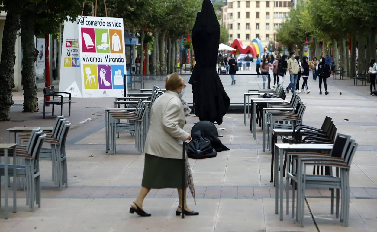 Una señora pasa ante una terraza vacía en Miranda de Ebro. A. Gómez / EP