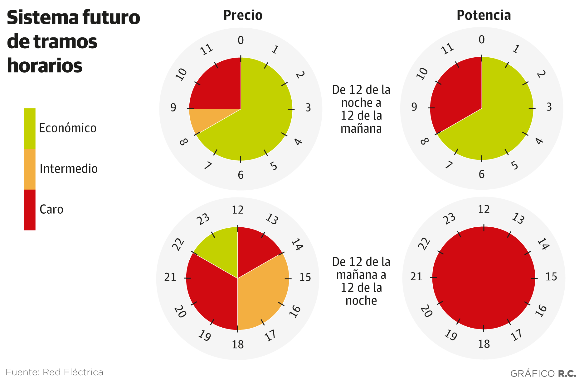 El reloj se convertirá en el mejor aliado de los hogares a la hora de rascar algunos euros en la factura, sobre todo en las temporadas de mayor consumo (verano e invierno). Las franjas en las que el precio estará más barato serán las madrugadas, mediodías y última hora de la noche. Será más recomendable consumir electricidad desde la medianoche a las 08.00 horas del día siguiente; y después de la cena, desde las 22.00 a las 00.00 horas. El coste será intermedio a primera hora (entre las 08.00 y las 09.00 horas) y a mediodía (desde las 14.00 hasta las 18.00 horas). Y finalmente, el precio repuntará durante las mañanas (de 09.00 a 14.00 horas) y las tardes (entre las 18.00 y las 22.00 horas).