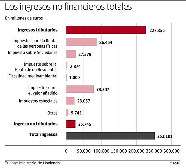 El Gobierno prevé recaudar 227.356 millones de euros a través de impuestos directos e indirectos, lo que supondría un 9,5% más que el año anterior, cuando a pesar de haber presupuestado 210.000 millones finalmente se obtuvieron poco más de 207.600 millones. Este aumento de la recaudación viene sobre todo dada por el incremento previsto en el Impuesto de Sociedades, en el que se ha establecido una aportación mínima del 15% para grandes empresas.