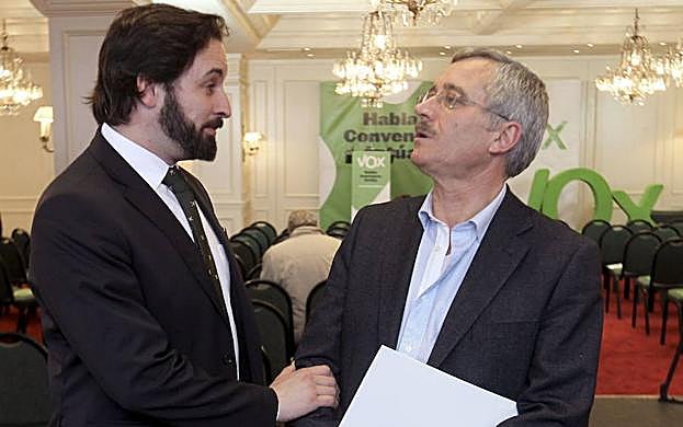 En noviembre de 2013 presentó la baja del Partido Popular por diferencias irreconciliables con su cúpula. Abascal no dudó en integrarse en un nuevo partido político de extrema derecha. Se hizo con la presidencia de VOX en 2014. La «denuncia del multiculturalismo», la «defensa de la identidad nacional frente a los intereses de Bruselas» y la salvaguarda «de los pueblos europeos frente a la masiva inmigración islámica». Postulados cercanos a los que promulgan otras formaciones ultraderechistas europeas como el Frente Popular francés, un espejo dónde siempre se ha mirado. En la foto, saluda a José Antonio Ortega Lara, funcionario de prisiones secuestrado por ETA entre 1996 y 1997, y actualmente integrado en el partido.