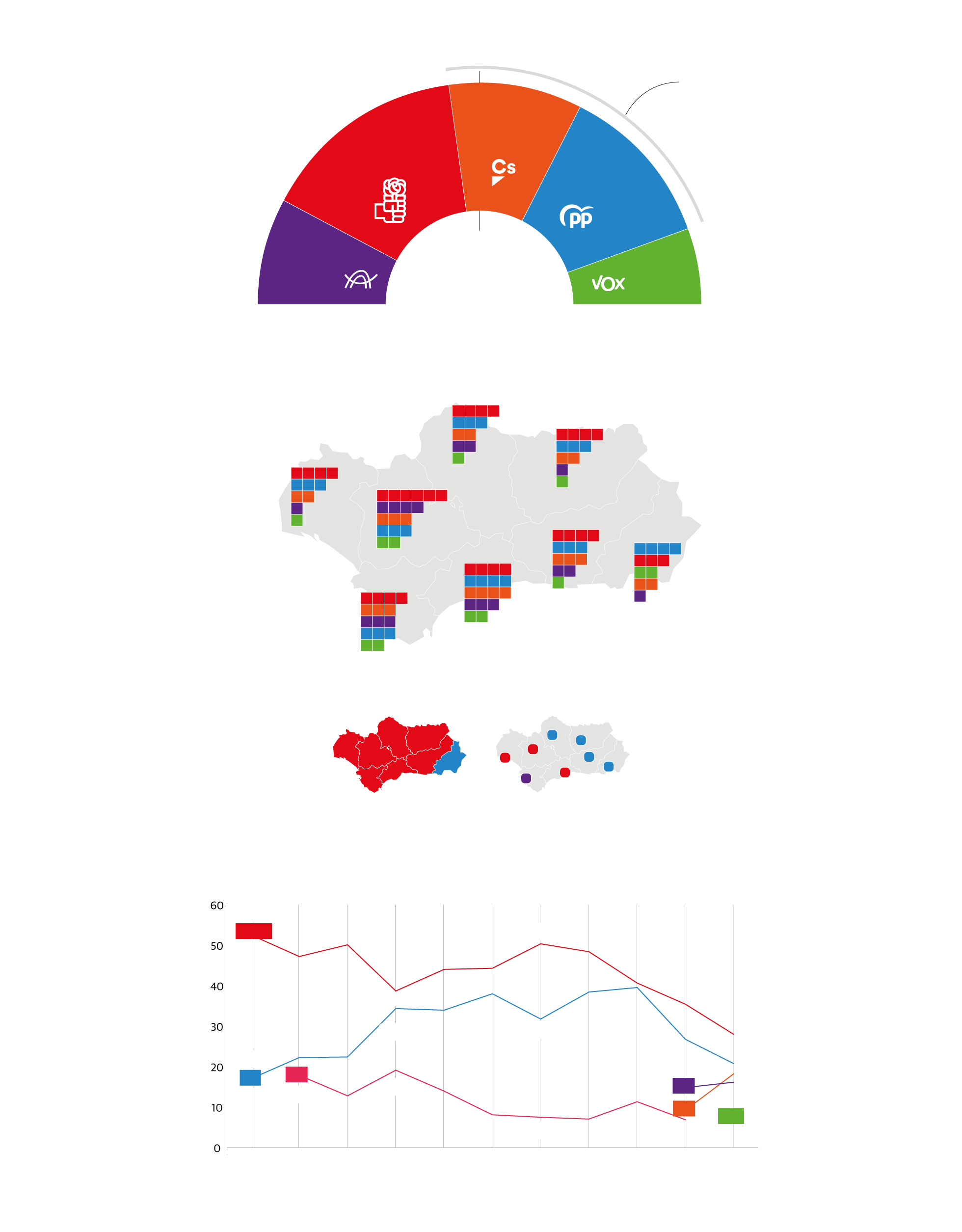 La posibilidad de verse abocados a un pacto con Vox –que aunque quizá menos de lo esperado incialmente, mejorará sus resultados de 2018– sigue existiendo. Santiago Abascal y su candidata, Macarena Olona, han dejado claro que aunque el PP solo necesite un escaño suyo para superar la investidura exigirán entrar en el Ejecutivo. Pero los populares confían en quedar tan cerca de la mayoría absoluta, situada en 55 parlamentarios, que a la hora de la verdad no puedan cumplir esa amenaza so pena de ser percibidos como una fuerza obstruccionista.