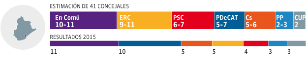 En tercer lugar estaría el PSC, que también sube con fuerza al pasar de 4 concejales a 6-7 que obtendría el 26-M. PDeCAT lograría entre 5 y 7 ediles, mientras Manuel Valls, cuya lista recibe el apoyo de Ciutadans, le sigue de cerca con entre 5 y 6 concejales. El PP se mantendría con entre 2-3 ediles, mientras que la CUP pierde 1 y se queda con 2.