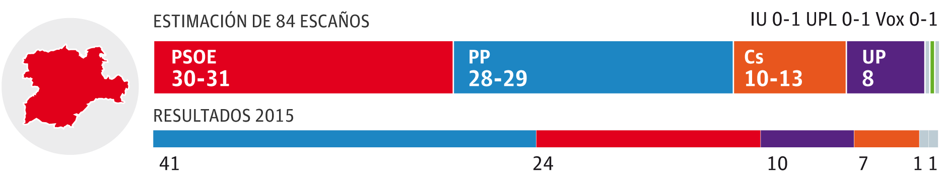 El actual presidente de Extremadura, Guillermo Fernández Vara, podría volver a renovar mandato en el caso de materializarse los resultados de la encuesta del CIS, sin embargo le haría falta pactar con el bloque de izquierdas o la abstención de, al menos, de Ciudadanos. Los socialistas rozarían la mayoría absoluta -que en el caso del parlamento extremeño se sitúa en los 33 escaños-, y obtendrían entre 30 y 32 escaños. El Partido Popular, por suparte, se desploma de los 28 escaños actuales a una horquilla de entre 19 y 21 diputados. Podemos pasaría de 6 a 7-8 y Ciudadanos aumentaría de 1 a entre 5 y 6 diputados. Vox, por su parte se queda fuera.