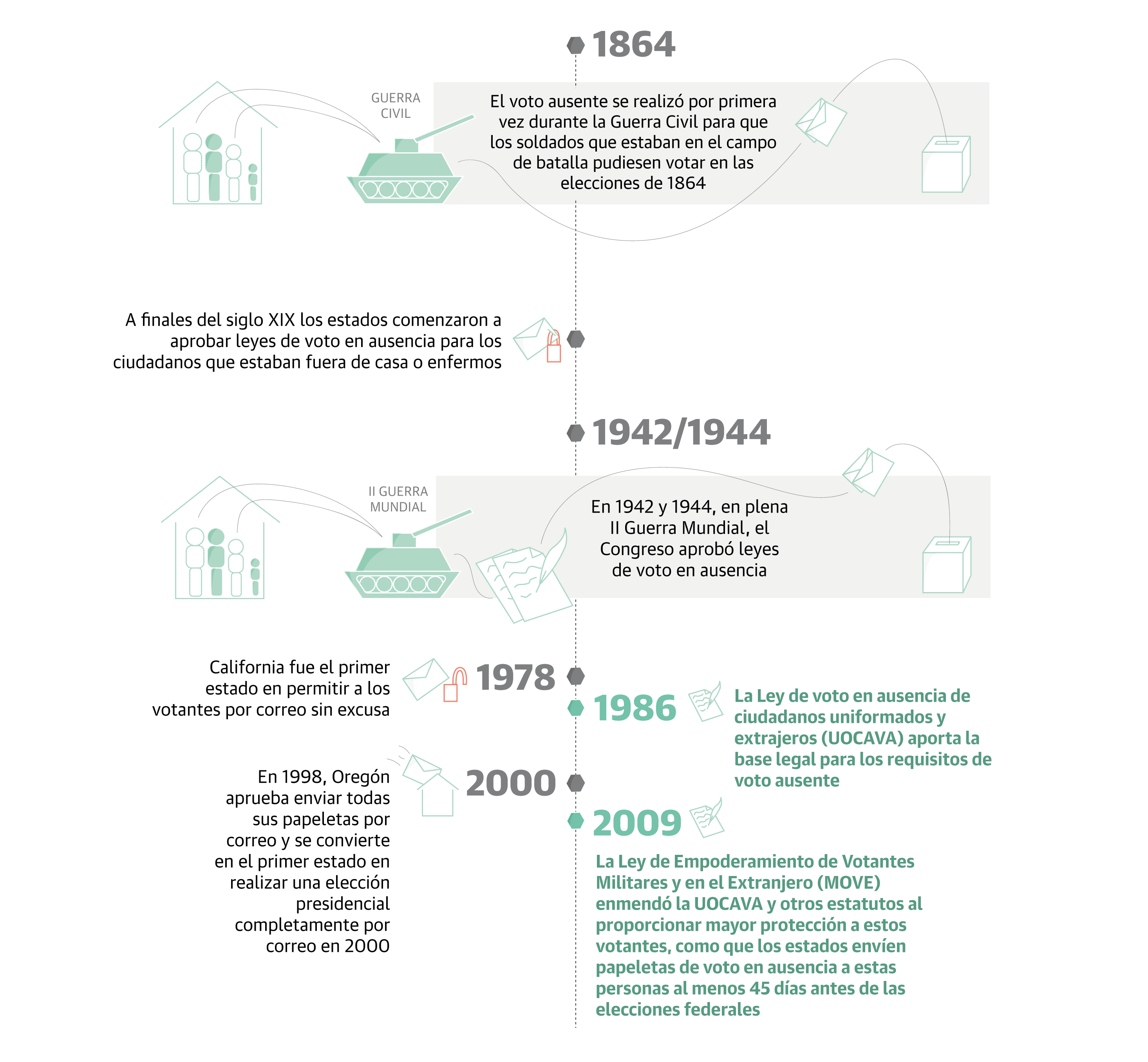 El voto ausente y el voto por correo son fórmulas diferentes según el estado en el que se empleen. No obstante, ambas opciones «se han considerado sinónimos en los Estados Unidos porque, históricamente, los votos ausentes se distribuían por correo a los votantes que se encontraban temporalmente fuera de sus hogares», explican en el Laboratorio de datos y ciencias electorales del Instituto Tecnológico de Massachusetts. Los primeros en hacer uso del voto ausente o por correo fueron los soldados estadounidenses en plena contienda y los políticos desplazados a Washington, continuó con quienes vivían en el extranjero y poco a poco los estados fueron aprobando leyes para mejorar la elegibilidad de sus ciudadanos, estuviesen donde estuviesen.