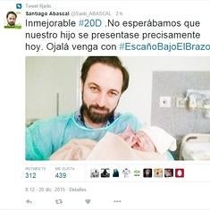 Una de las imágenes del día la ha protagonizado el candidato de VOX, Santiago Abascal, que ha sido padre por cuarta vez en la madrugada de este domingo, según ha anunciado él mismo en su cuenta de Twitter. "Inmejorable 20D. No esperábamos que nuestro hijo se presentase precisamente hoy. Ojala venga con un #escañobajoelbrazo", explicaba el candidato en la red social junto a una foto del recién nacido.