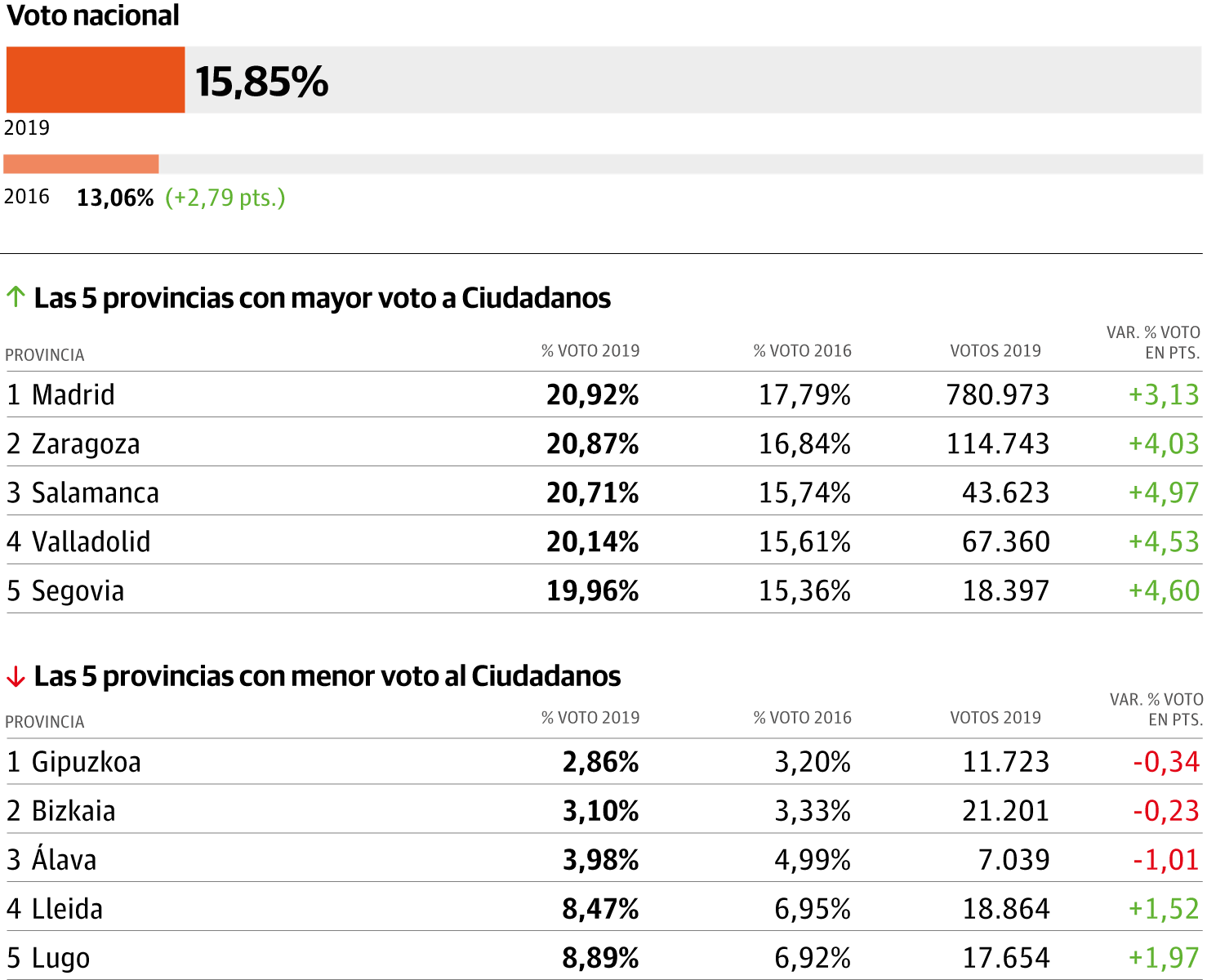 Estas elecciones, por otra parte, han servido para desmontar la leyenda de que Ciudadanos era un partido urbanita. En provincias de la denominada 'España vacía' como Badajoz, Cáceres, Teruel y Zamora es en las que Ciudadanos consigue una mejor variación porcentual con respecto a 2016. Como el resto de formaciones de caracter nacional, su presencia en los feudos nacionalistas es residual.