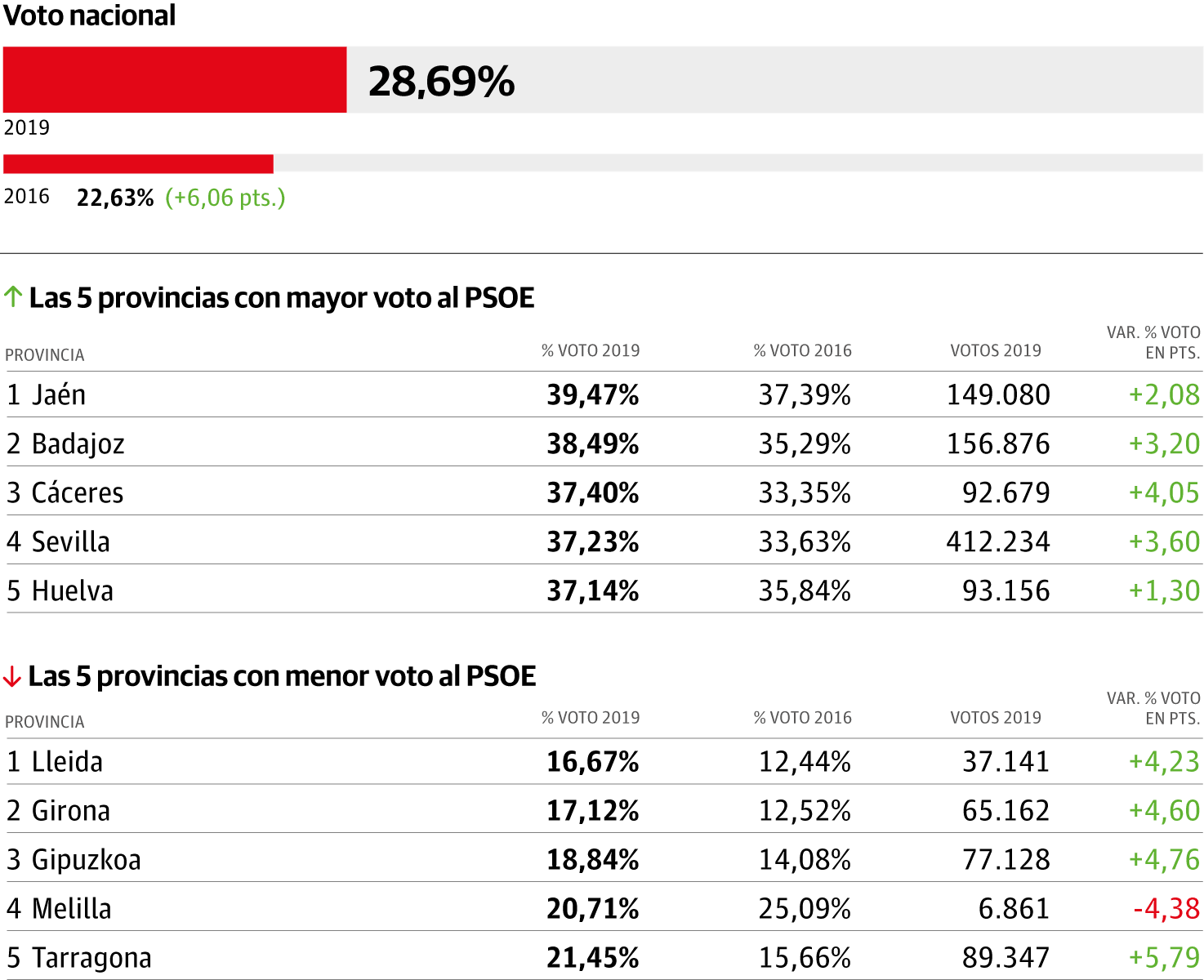 Los resultados electorales demuestran que la estrategia de Pedro Sánchez ha conseguido un éxito indiscutible a la hora de movilizar a unos votantes que en las últimas andaluzas habían decidido quedarse en casa y permitido un cambio de Gobierno en el Palacio de San Telmo. Que los socialistas mantengan inalterables sus feudos andaluces es también un mensaje interno de indudable calado. Lo que Susana Díaz no pudo retener, Pedro Sánchez lo ha salvado. Pese a todo, hay un aspecto a tener en cuenta: es en el sur donde el PSOE sube con menos intensidad con respecto al resto de España. Es sintomático que el mayor crecimiento socialista se encuentre en Galicia, la comunidad en la que el histórico bipartidismo menos se desgasta. En la esquina noroeste de España, el PP y el PSOE concentran el 60% del voto.
