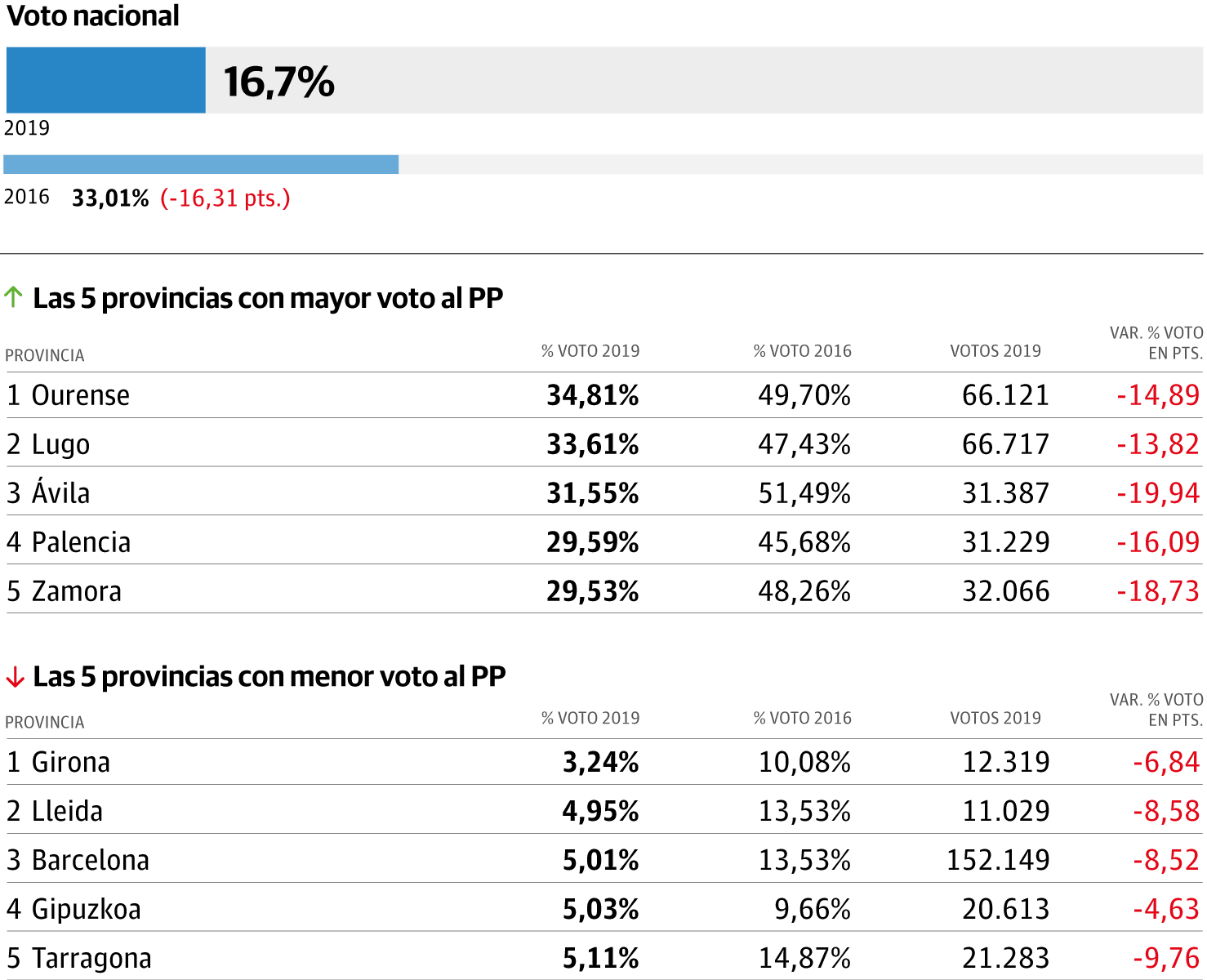 El presidente de Galicia, Alberto Nuñez Feijoo, fue rotundo en la noche electoral. Él se encargo de dejar claro que había obtenido los mejores resultados del PP en España. Los gallegos vuelven a votar al PP, un partido que ha visto surgir de esa comunidad a dos de sus dirigentes históricos -Fraga y Rajoy- y que sigue otorgando mayorías absolutas a los populares por más hostil que sea la política nacional hacia los conservadores. Sin embargo, los datos revelan también que esa fortaleza comienza a erosionarse y que la formación que ahora dirige Pablo Casado pierde hasta diez puntos con respecto a las últimas elecciones. El liderazgo, no obstante, se lo cede al PSOE y se deja 203.269 votantes respecto a las elecciones generales. El dato es muy similar en Castilla y León, históricos graneros del PP, pero donde se deja hasta 20 puntos.