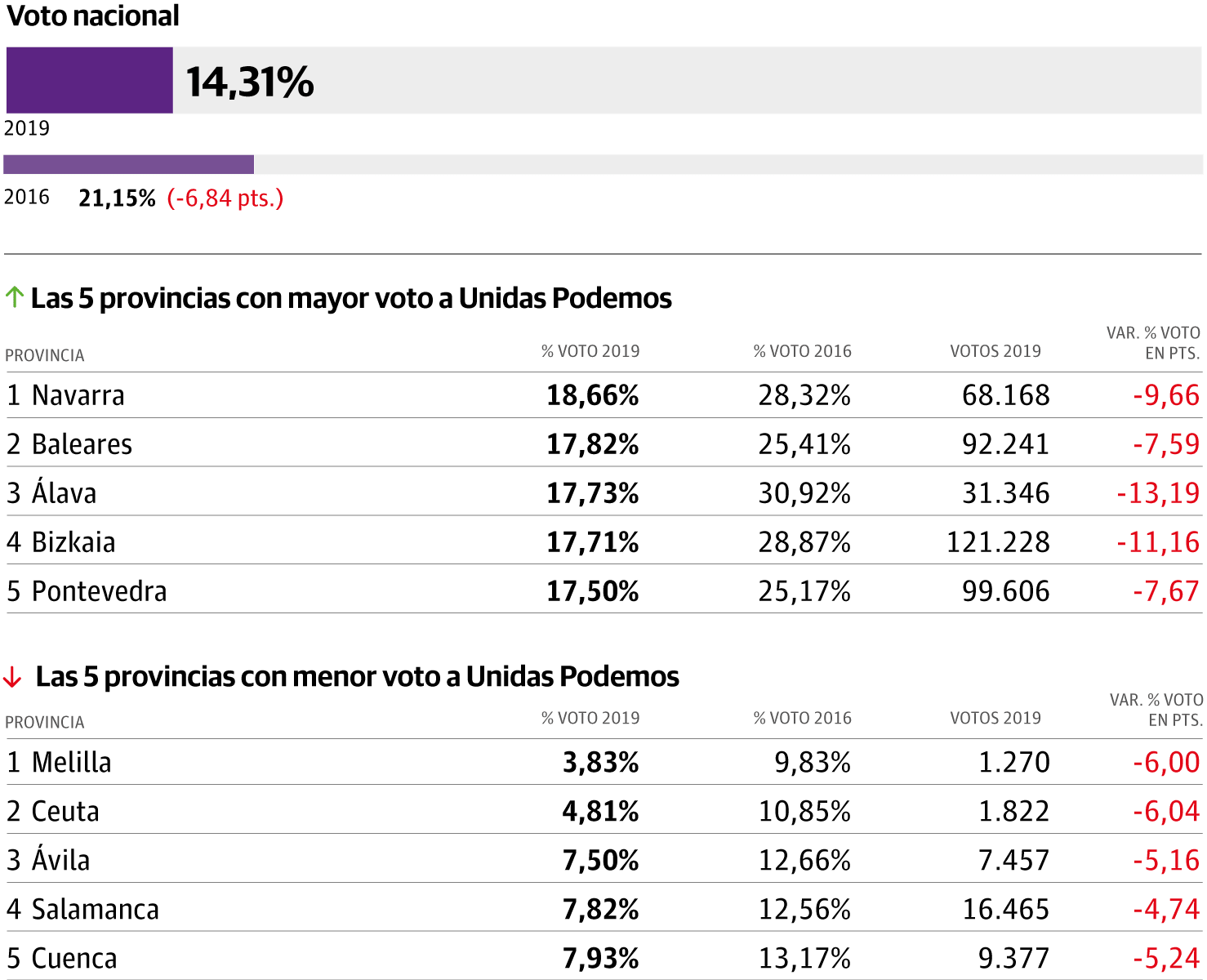 La fuerza de Unidas Podemos (UP) en territorios comoBizkaia o Álava revela la trasversalidad que ha conseguido el partido de Pablo Iglesias. Allí donde otras formaciones de ámbito estatal se estrella como el Titanic como el iceberg, el partido morado consigue sus mejores resultados porcentuales. En las anteriores generales, UP llegó a superar a PNV y a Bildu a la hora de nombrar representantes en el Congreso. Ahora, aunque ha visto reducirse ese poder y llega a perder 112.496 votos, sigue siendo una formación a tener en cuenta e incluso salva los muebles. Podemos demuestra así su capacidad de defender una estrategia que en las sociologías nacionalistas no es en absoluto refractaria. En el caso de Baleares, Unidas Podemos es el más votado pese a tratarse de una formación local sacudida por las purgas internas, en las que llegó, por ejemplo, a cesar a la presidenta del Parlamento balear. Los resultados de la formación morada también revelan que la definición de España como un país instaurado en una política de bloques es exacta y que en los lugares en los que la derecha se expande sin problemas la izquierda de Podemos se queda por debajo del 10%.