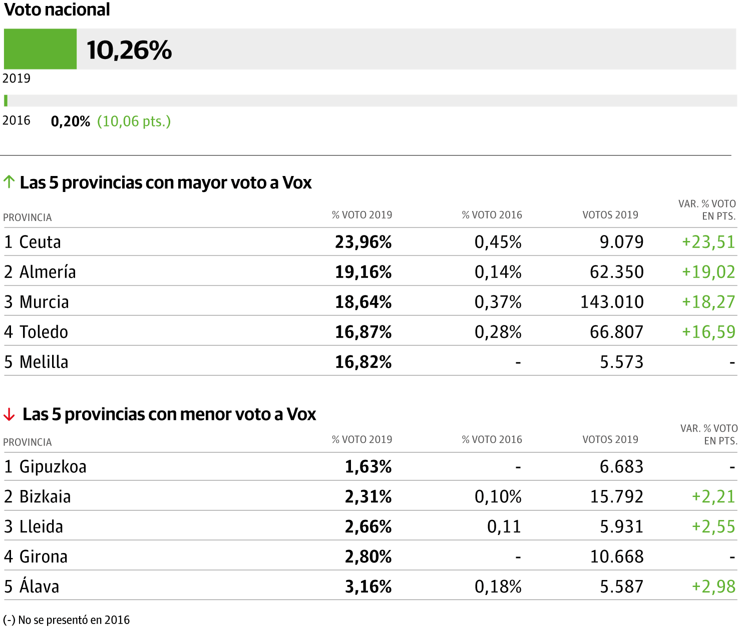 Resulta paradigmático que Vox obtenga sus mejores resultados porcentuales en Ceuta y en Almería. En la ciudad autónoma, no obstante, el partido de Santiago Abascal es superado por el partido socialista, que obtiene el único diputado en liza en la comunidad pese a que las encuestas le habían concedido el representante de la ciudad fronteriza. En Almería, por el contrario, consigue vencer claramente en dos localidades, El Ejidoy Níjar, y consigue un diputado en Cortes. Estos datos son una muestra evidente de que la emigración sigue siendo uno de los principales combustible del partido de ultraderecha. El Ejido, en este sentido, es una localidad con casi un 30% de población emigrante y fue el primer lugar de España en el que se advirtió la pujanza de este partido.