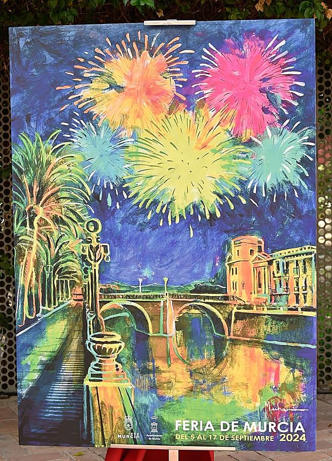 Así, el cartel muestra una nocturna aunque colorida estampa en torno al Puente Viejo, con el edificio del Parador del Rey y hornacina de la Virgen de los Peligrosa de fondo y con una hilera de palmas, ubicadas junto al paseo fluvial, que obtienen su réplica en el cielo con unos fuegos artíficiales que reproducen su forma, pero con la posibilidad de aplicarle tonos más brillantes a través de esa explosión de color. «Nos hemos fijado en el Puente de los Peligros -que cumple hoy 284 años- como emblema de la ciudad de la Feria», comentaba Francisca Muñoz, teniendo en cuenta que la Feria arranca cuando la Patrona, la Virgen de la Fuensanta, cruza este paso sobre el Segura, rumbo a la Catedral, y que será precisamente el río -con veinte ubicaciones-el eje conductor de la celebración.