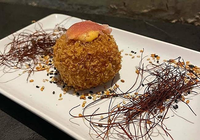 Un plato coreano a base de repollo chino fermentado con chile y otros ingredientes ('kimchi') anexado a cortes de mariscos o pescados crudos ('sashimi'). Esta es la mezcla con la que trabajan en La Vermutería de la Charito para recrear una croqueta de vanguardia que conecta la gastronomía asiática con la española en un mismo manjar.