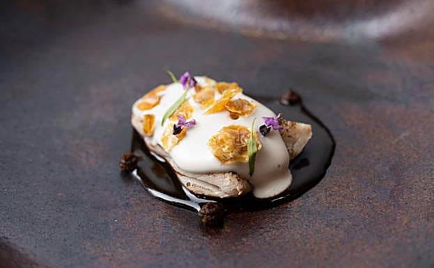 Los dos chefs van a relatar esas historias con cuatro platos. El primero se llama 'Plantas olvidadas de Canarias' y utilizamos las que salen de manera espontánea, natural. «Usamos dos plantas que podemos trabajar todo el año, el ficó y la verdolaga, que salvaron de la hambruna», dice Domínguez. Con esto preparan una yema curada en salsa hecha con el hongo koji (Aspergillus oryzae), y mojo de esos dos vegetales. Además se cruzan los pasos de los pescadores «dispersados en la isla. Cada uno dedicado a un tipo de pesca tradicional». En este plato entran los que capturan con el tambor, un arte en el que entran las morenas y quedan atrapadas. «La morena la trabajamos como la anguila japonesa, cocinada 45 minutos y laqueada con salsa barbacoa».