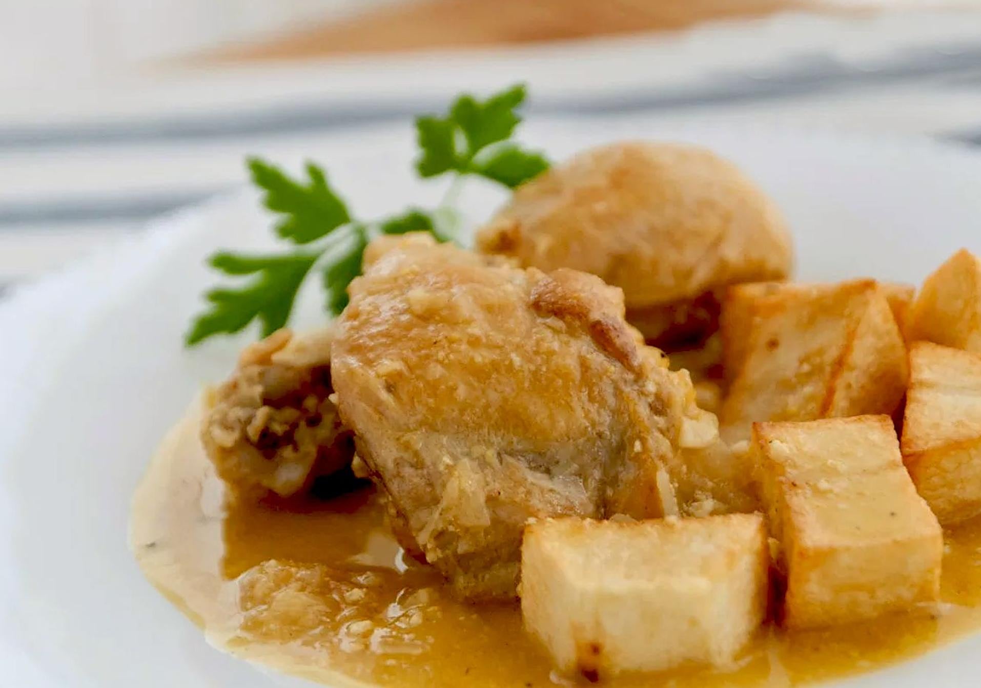 Ingredientes: 1 pollo troceado (1,5 kg.) 1 cebolla grande. 2 huevos. 2 dientes de ajo. Azafrán de pelo. 1 rebanada de pan. Almendras. Vino blanco seco. Caldo de ave. Aceite de oliva virgen extra. Sal. Pimienta negra.