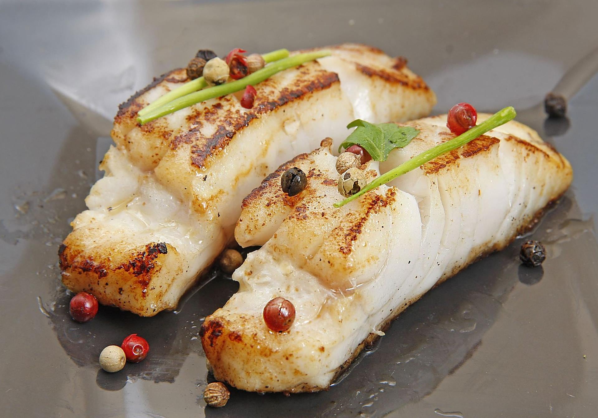 Ingredientes: 8 trozos de lomo de merluza, aceite de oliva, sal, pimienta blanca en grano, pimienta negra en grano, pimienta roja en grano, cebollino, ½ limón y tomillo.
