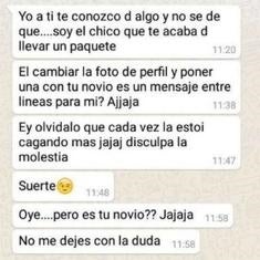 «Yo a ti te conozco de algo y no sé de qué, soy el chico que te acaba de llevar un paquete», decía el primero de los mensajes de este desconocido. Pero el tono de estos mensajes se torna cada vez más molesto cuando empieza a preguntar si tiene novio. Ella ante tal atrevimiento decidió denunciarlo en su perfil de las redes sociales donde la empresa para la que trabaja el presunto repartidor no se demoró en responder.