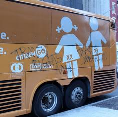Ahora, día 24 de marzo, varios miembros de su campaña han compartido en Twitter el estado en el que ha quedado el autobús tras sufrir un acto de vandalismo a su paso por Nueva York. Durante el ataque lanzaron piedras a los cristales del autobús, realizaron pintadas en su costado donde se puede leer «Liberación 'Trans'» o «Derechos de los 'trans' ya», lo que califican de todo un atentado contra la libertad de expresión.