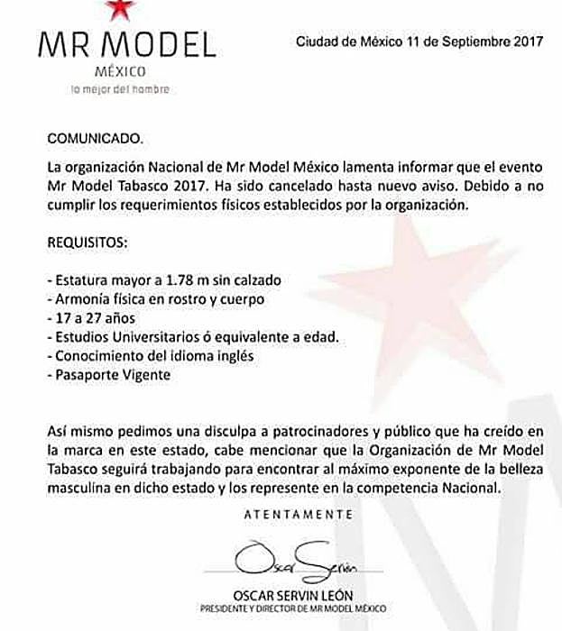 El concurso Mr Model Tabasco para adultos fue cancelado pero con vistas a tener mejores candidatos en un futuro. Mientras tanto, el que sí que sigue adelante es el de Mr Model Junior, para menores de edad.