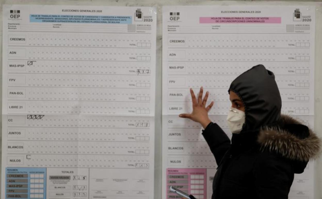 Una mujer consulta las listas de partidos en un colegio electoral de La Paz. reuters