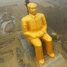 La estatua dorada, de 37 metros de alto, se erige en medio de un campo en la provincia de Henan y representa al hombre que dirigió China con mano de hierro durante tres décadas sentado y con las manos cruzadas.